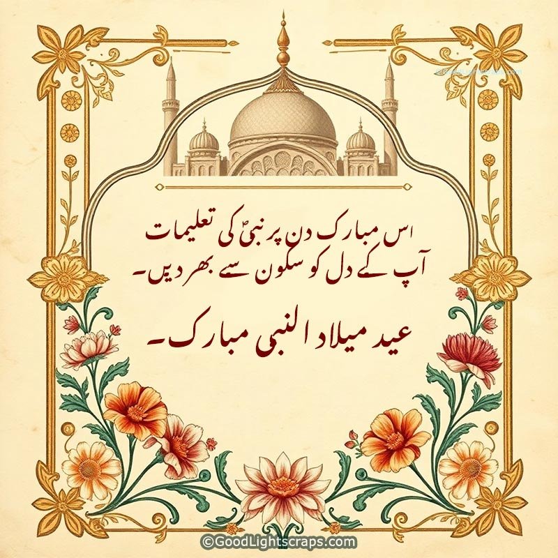 For many, expressing Eid Milad-un-Nabi wishes in Urdu captures the warmth of devotion most beautifully. Urdu messages like “عید میلاد النبی مبارک ہو” (Eid Milad-un-Nabi Mubarak ho) or “اللہ کی رحمتیں آپ پر ہوں” (Allah ki rehmatain aap par hon) express deep cultural and spiritual meaning. Sharing Urdu greeting cards with heart touching quotes with family, friends or on social media connects you to tradition and emotion. Whether written on beautiful images or WhatsApp statuses, Urdu Milad-un-Nabi wishes convey sincerity, respect and blessings on this holy day. A heartfelt Urdu Eid-e-Milad message can make your greetings truly special and memorable.