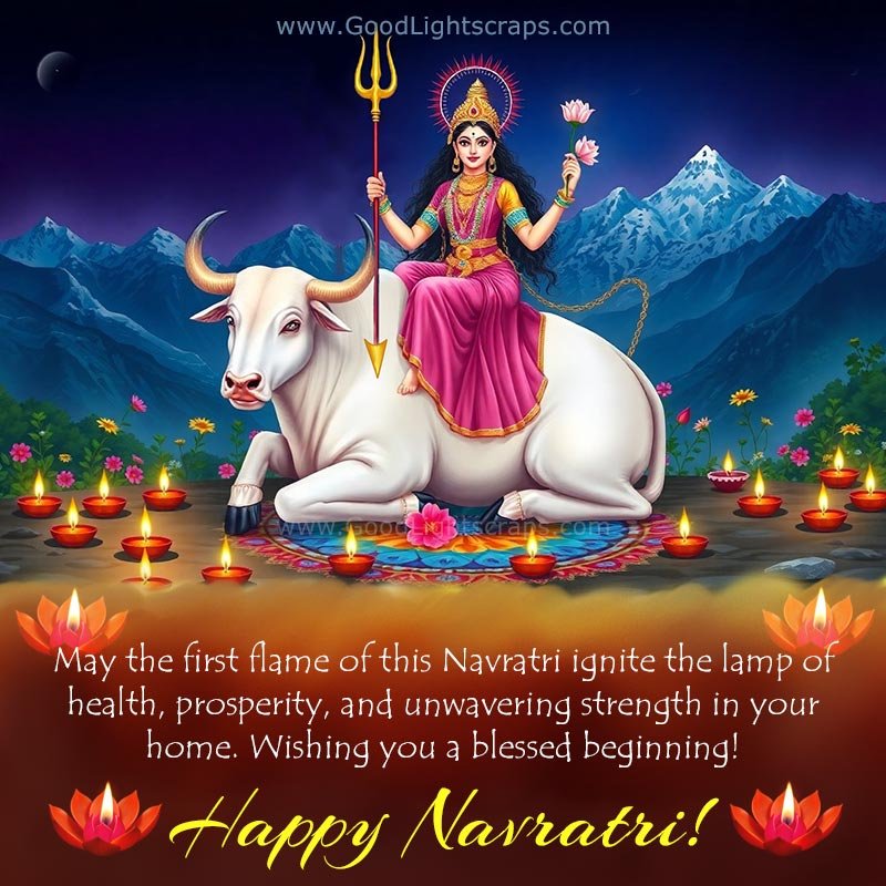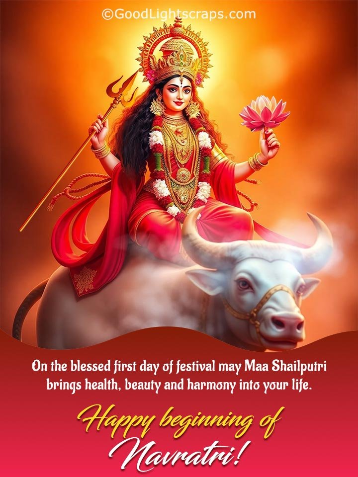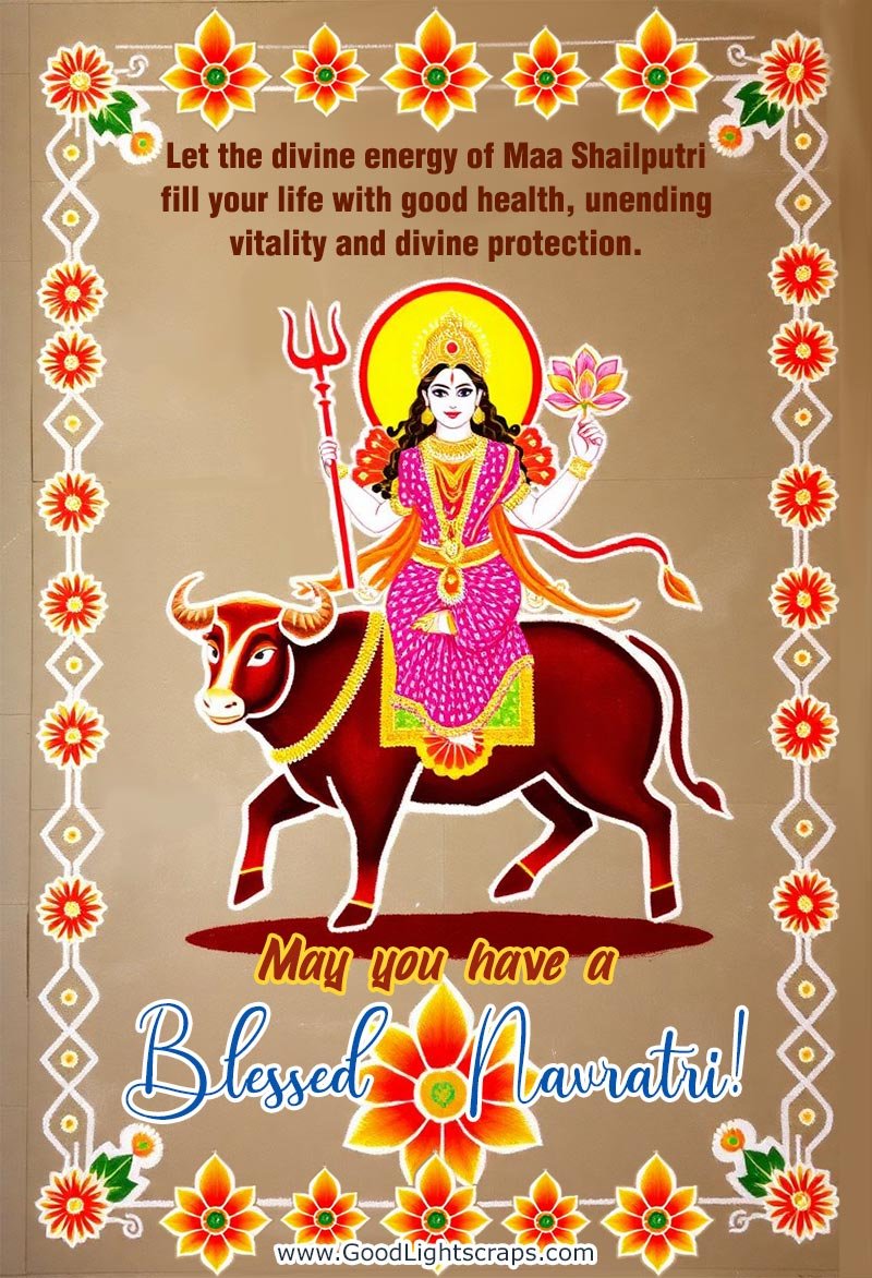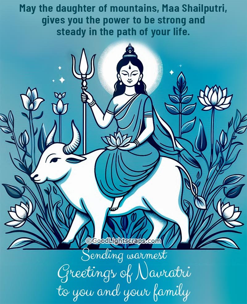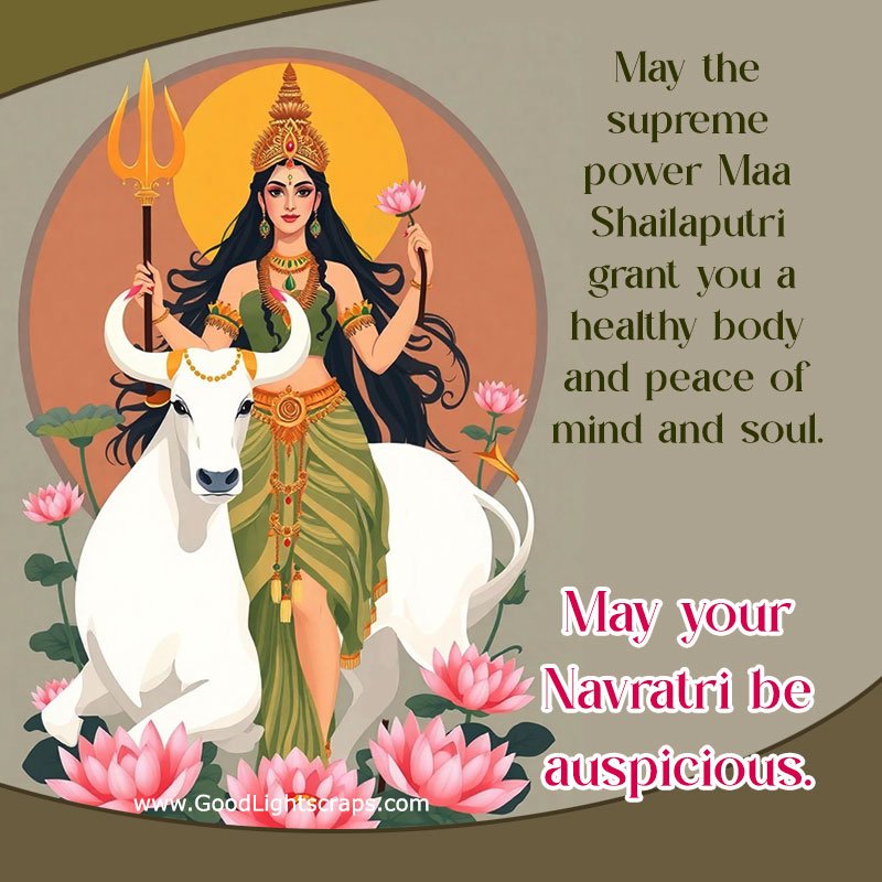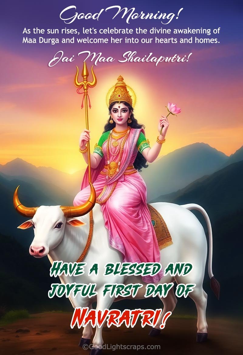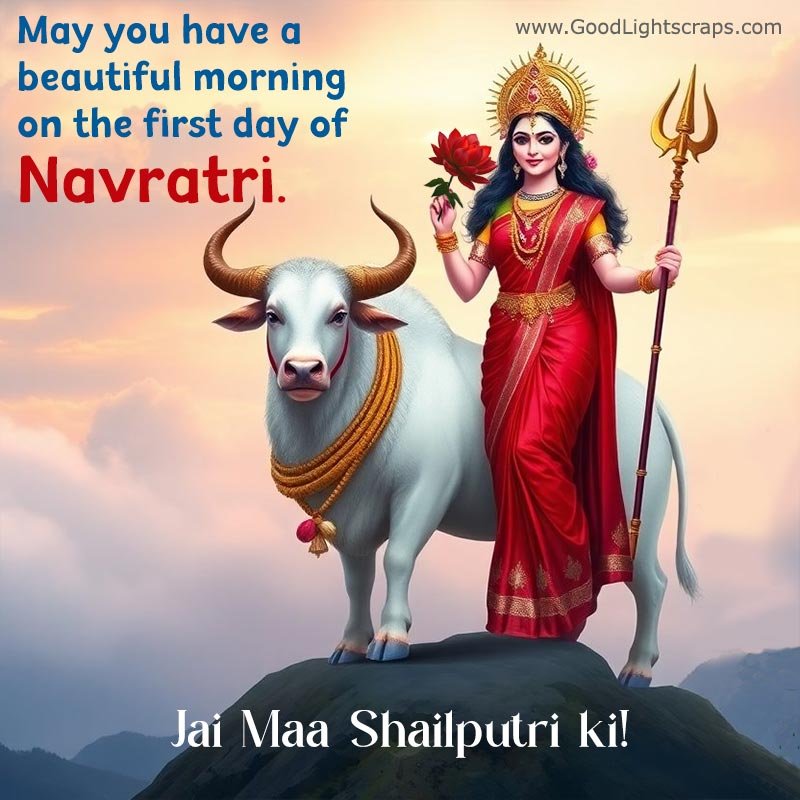 The First Day of Navratri is the day we worship Goddess Shailaputri (the daughter of mountain). She symbolizes the power of nature, strength, and purity, and her worship marks the start of the Navratri festival with blessings of stability health, peace of mind an soul. Share the energy of Maa Shailputri with beautiful greetings images with quotes, wishes and messages with your friends, family and loved ones. Start the day with Good morning messages with Mata Shailputri images and captions. Get